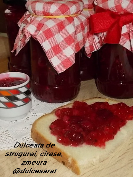 Aromele verii pastrate pentru iarna in borcanele din camara! De data aceasta am facut o dulceata gustoasa si parfumata din strugurei rosii, cirese carnoase si zmeura. Strugureii pt cine nu stie, la noi in Ardeal sunt coacazele. Noi avem in gradina o tufa batrana de cand eram noi copii. Anul acesta nu a fost prea mare rodul, de aceea am combinat strugureii cu cirese si zmeura. Nu conteaza cantitatea pt fiecare fruct in parte, eu niciodata nu am tinut cont de acest lucru. Am combinat fructele in cantitatile pe care le-am avut.